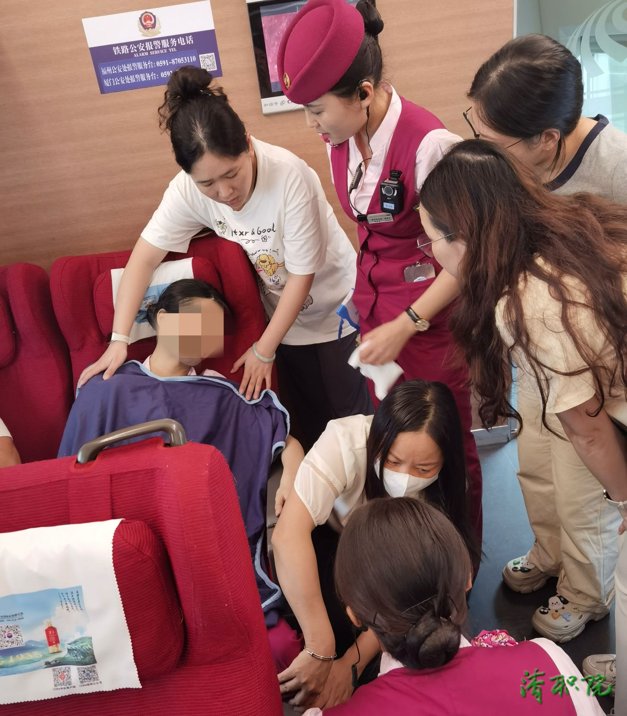7月19日,在清职院骨干教师核心能力养成策略专题培训班学员返程途中,一场突如其来的紧急情况考验了护理学院教师的专业素养和应急能力。上午11点30分左右,当列车广播紧急呼叫医疗援助时,来自清职院护理学院的吴晓芳、欧阳一蕙、李小红和陈意梅等4位教师迅速响应,赶往15号车厢,为一位突发疾病的患者提供了及时有效的急救。